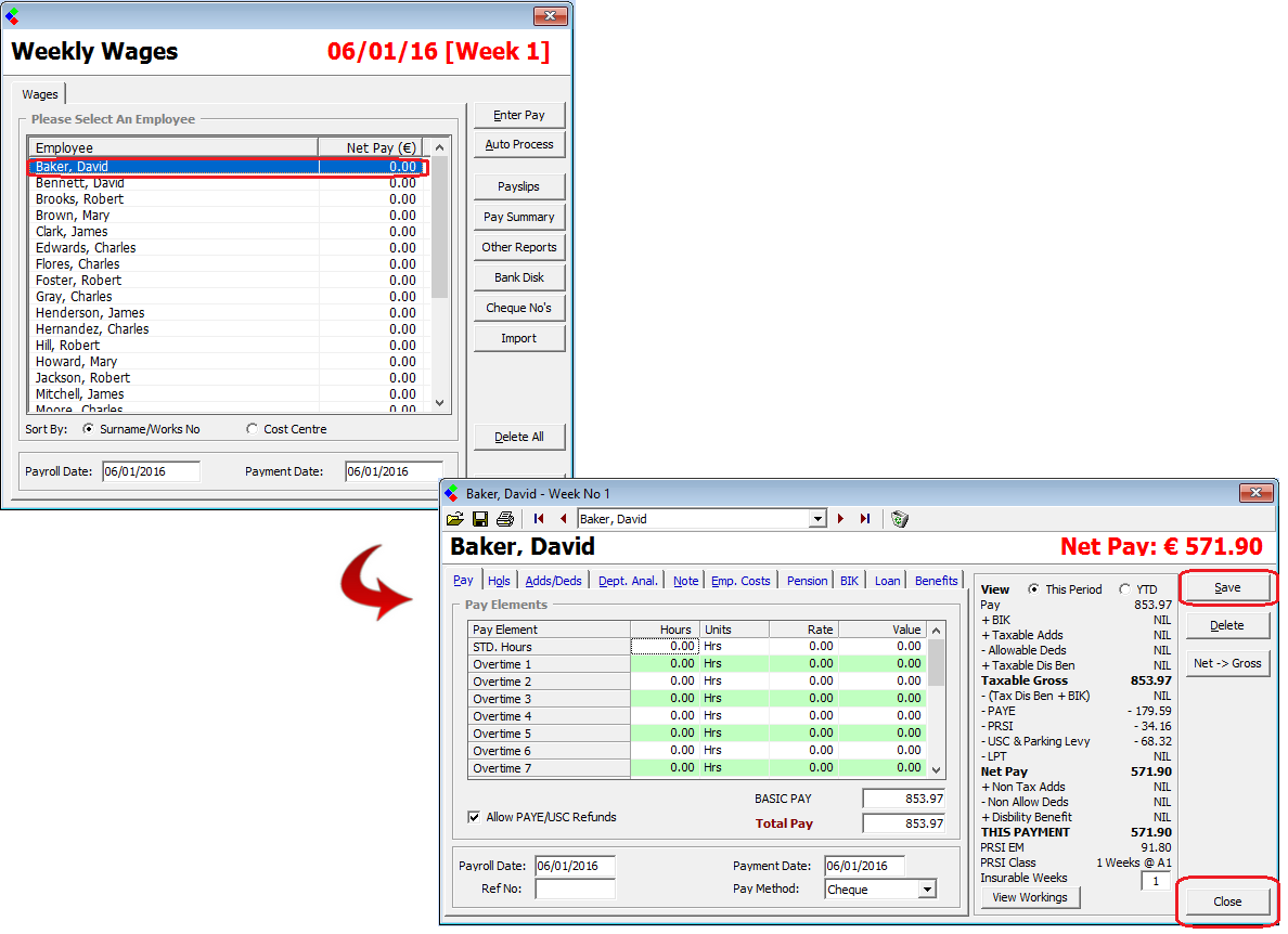 CollSoft Payroll offers a batch processing option called Auto Process. This function will process all the employee records in a batch, copying the payroll details processed in the previous pay period and applying them to the current pay period. For exceptions, it is possible to simply amend the individual employee payroll details for the period by simply selecting the employee from the listing (as detailed in Step 1 above), prior to selecting to Auto Process.