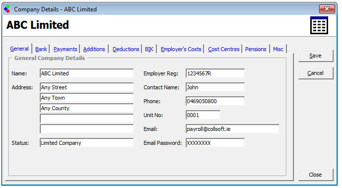 In creating a Company you must set the master details by which the Company will operate payroll as a whole, for example, the normal business address of the employer, the bank account from which payroll will be paid, the standard set of additions and deductions, the varying cost centres (if any) etc.