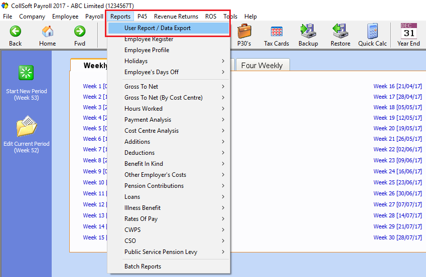 CollSoft Payroll includes a function to create customised reports. This function can be found on the reports menu, User Report/Data Export.