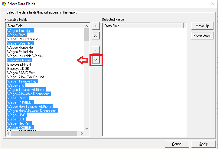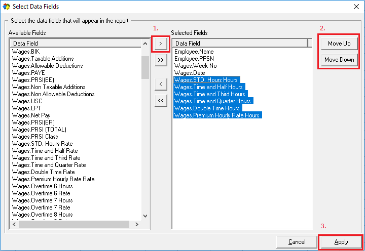 Remember to include the Employee Name and PPSN to create the report by employee. - Use the Move Up and Move Down options to change the order of the selected fields (as shown at 2.).