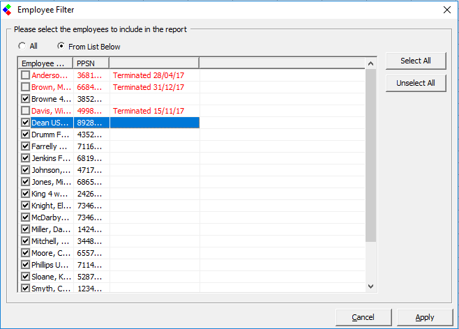 - Select to include all employees or choose to select from the list to filter who to include in the report.