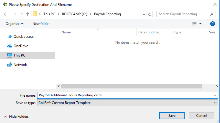 User Defined Report: Save template window