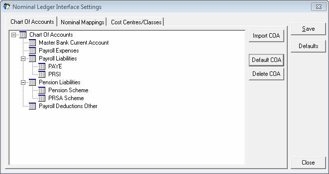 Before you can create any nominal mappings you must specify the Chart Of Accounts that you want to use. CollSoft Payroll includes a default Chart Of Accounts (shown in above screen shot), but you can import your existing QuickBooks Chart Of Accounts.