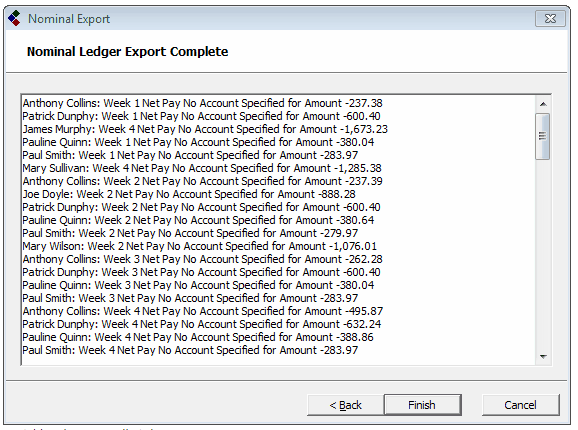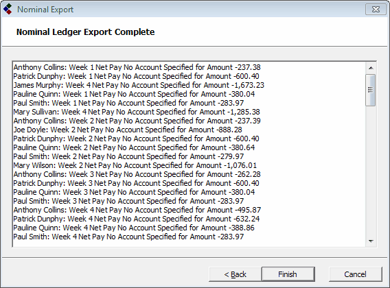 If for any reason CollSoft is not able to export your payroll data then you will be shown a list of errors at the end of the wizard (and your export file will not be created).