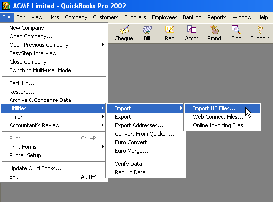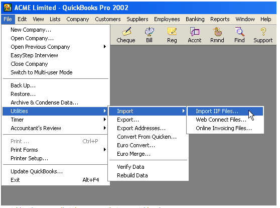 Select the Import IIF Files... option from the File>Utilities>Import menu in QuickBooks. This will start the QuickBooks import wizard that will import your payroll data into QuickBooks.