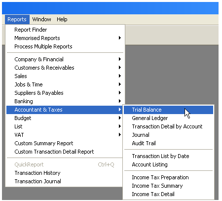 Print a trial balance report in QuickBooks by selecting Trial Balance from the Accountant & Taxes submenu of the Reports menu, choosing the appropriate dates.
