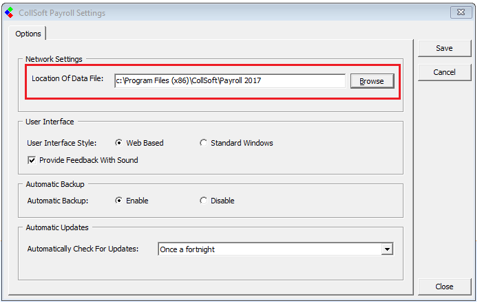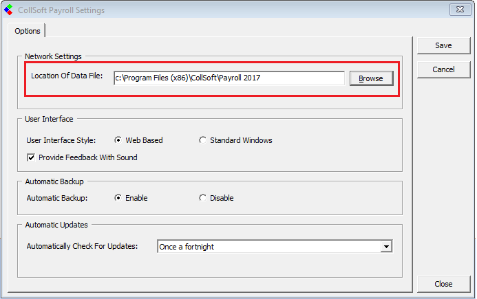 - In the field ‘Location of Data File’ the default directory will be the installation directory of C:/Program Files (x86)/CollSoft/Payroll XXXX.