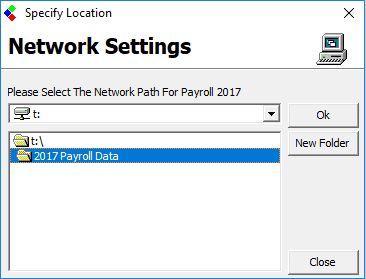 - A network settings utility will then be displayed. Choose the required drive and directory on the server from which you wish to share or operate the payroll data from.
