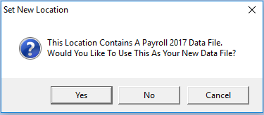 Click Yes on this message and the payroll will use the data file present in the location specified as your new data file location.