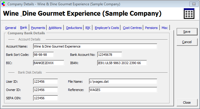 The Account Name, Sort Code, Account Number, BIC and IBAN fields refer to the bank account from which the wages will be paid.