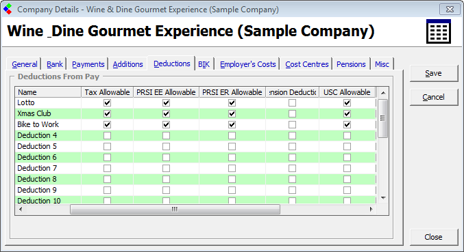 If you indicate that the deduction is to be taken from the Net Pay, then this deduction will be made after the tax has been calculated (and deducted) from the pay. An example of such a deduction might be a staff loan repayment. Untick Tax Allowable, PRSI Allowable (EE & ER) and USC Allowable to set up the deduction in this way.