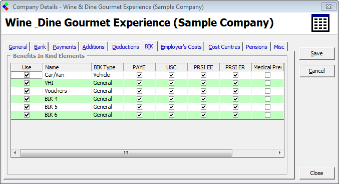 The BIK tab allows you to setup company BIK elements. To create a Benefit In Kind, simply follow the instructions below:
