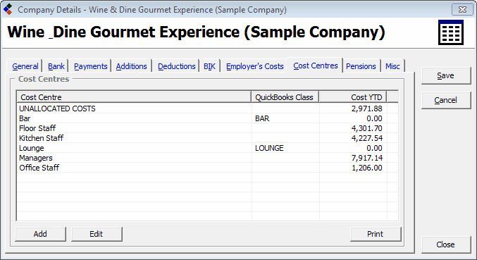 Cost Centres (sometimes called departments) are categories under which you can record an individuals employee payroll costs.