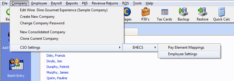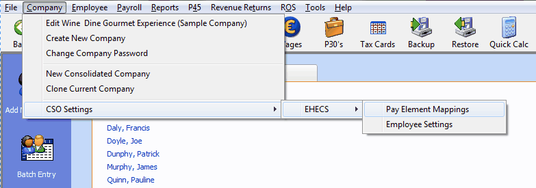 To open the “Pay Element Mapping Screen” select the “Company” > “CSO Settings” > “EHECS” > “Pay Element Mappings” menu (below)
