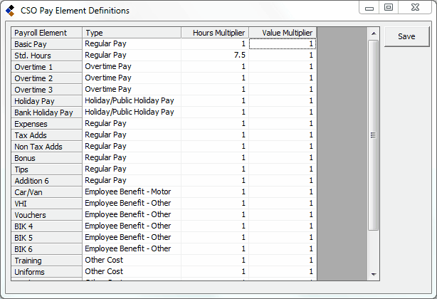 Each pay element in payroll can be mapped to its CSO equivalent using the Pay element mappings Screen.