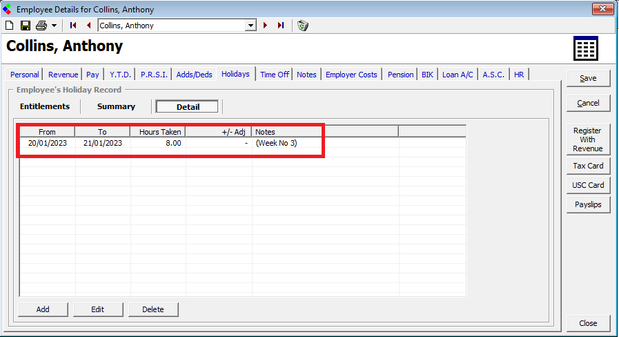 The Detail screen shows you the dates that Holidays were taken by this employee, as shown below.