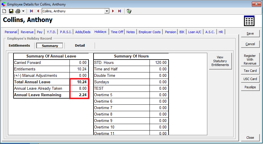 The Summary Screen shows you how many Holidays an employee has, how much they have taken and how much they have left, as shown below.