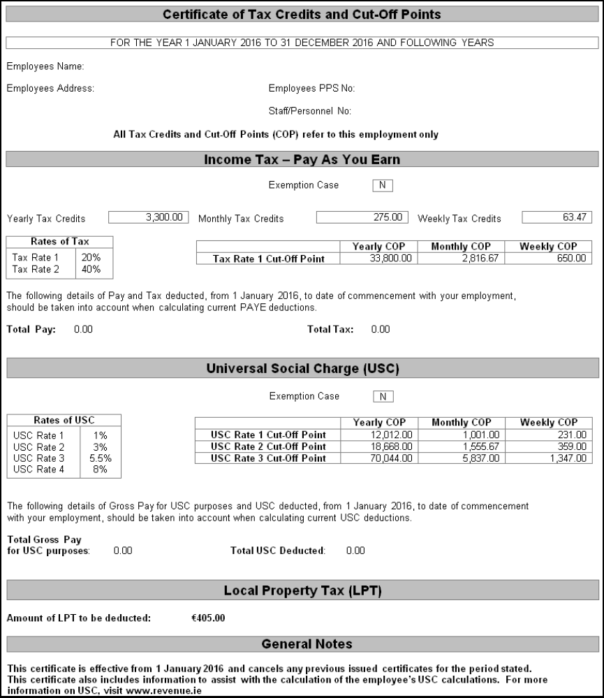 Revenue issues a Tax Credit Certificate to every employee who makes a claim for tax credits. The certificate sets out in detail the amount of tax credits and standard rate cut-off point (SRCOP) that Revenue has determined to be due to the employee. The Tax Credit Certificate issues to the employee when: