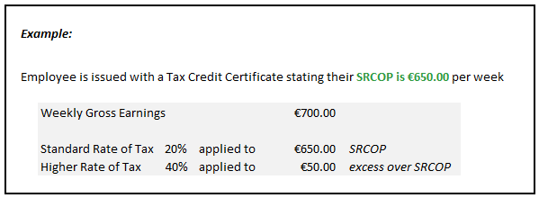An employee's Standard Rate Cut-Off Point (SRCOP) is the amount of their personal standard rate tax band 20%. For each pay period, tax is paid at the standard rate of 20% (rates for 2019) up to the SRCOP. For the balance of earnings above the SRCOP the higher rate of tax of 40% (rates for 2019) is applied. For current rates, please refer to Revenue website.