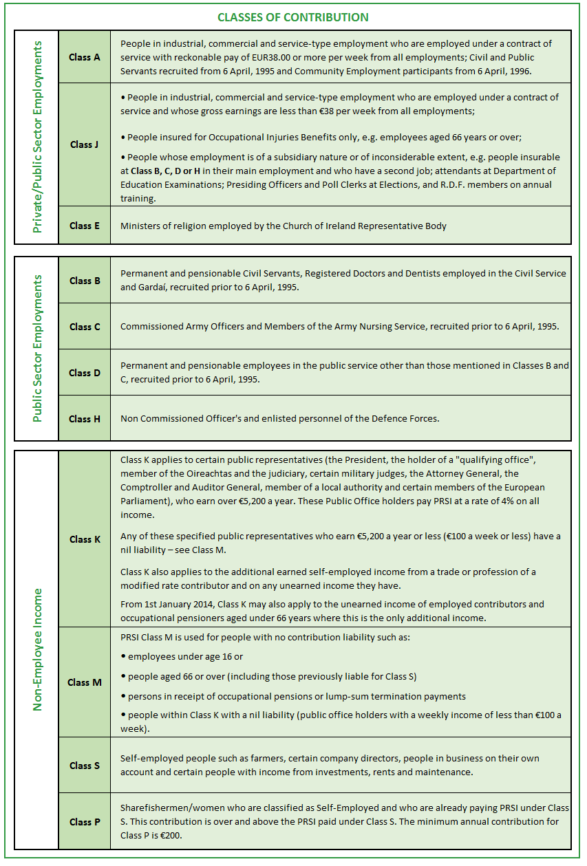 In general, PRSI contribution classes are decided by the nature of a person's employment.