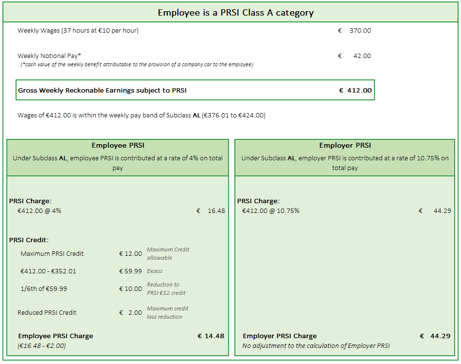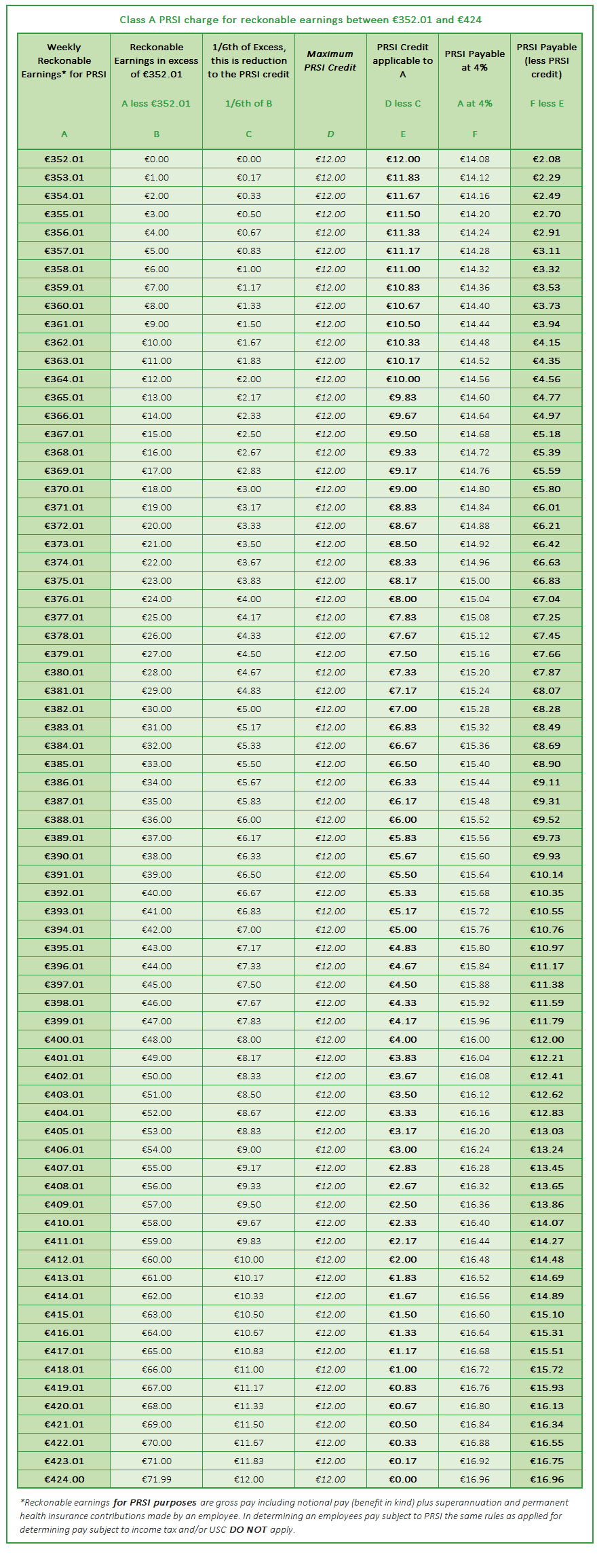 With effect from 01st January 2016 a PRSI Credit has been introduced specifically for PRSI Class A, whereby earnings between €352.01 and €424, are reduced by a tapered weekly PRSI credit (subject to a maximum credit of €12.00).