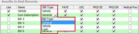 The first benefit, which is named vehicle by default, is also set as the BIK Type vehicle by default. All other benefits should be categorized as either General benefit, e.g. medical insurance premiums, gym memberships etc. or a Loan made by the employer to the employee.
