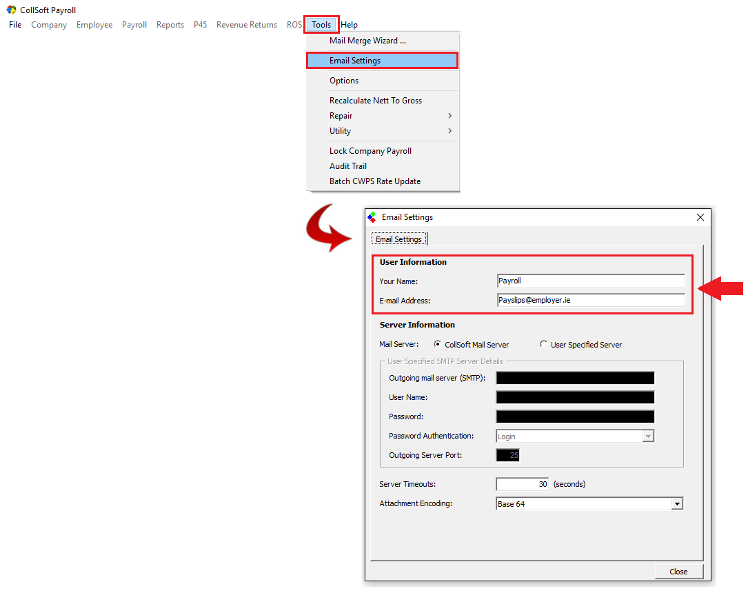Some instances of CollSoft Payroll may not be saving the sender email details when emailing payslips. This is directly related to the user not having the required access rights to update the Windows registry to where these details are saved.