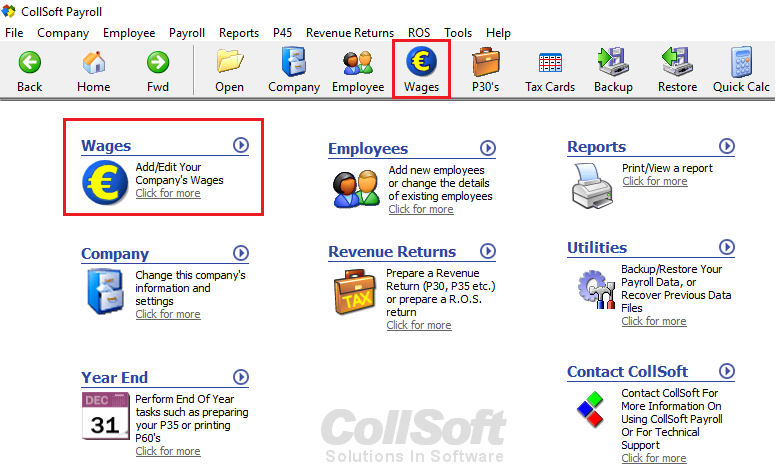 Access the Wages function through either the Toolbar or from the quick access icon option from the Home page.
