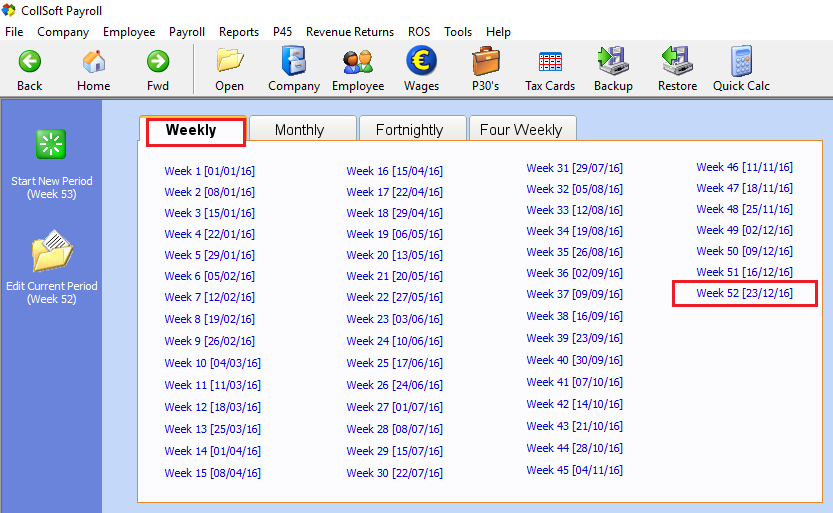 - Choose the final pay period for the year, for example, week 52.