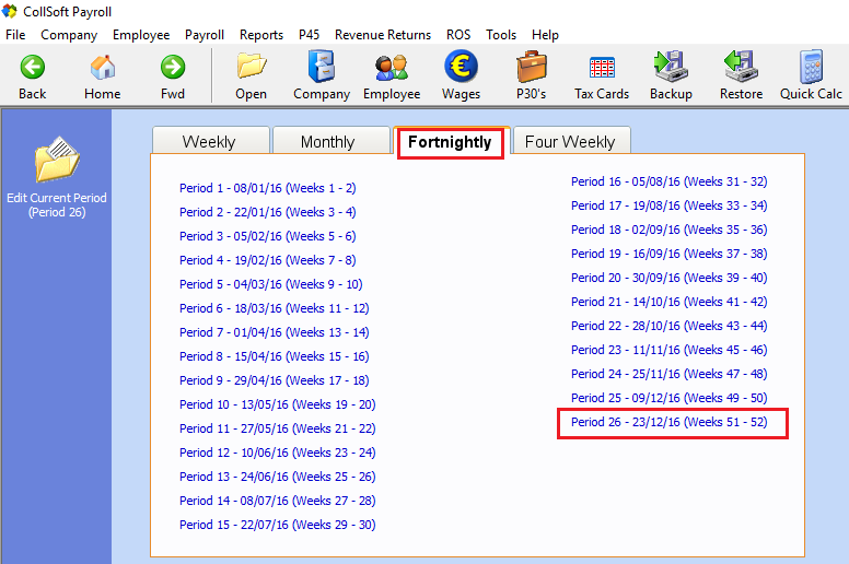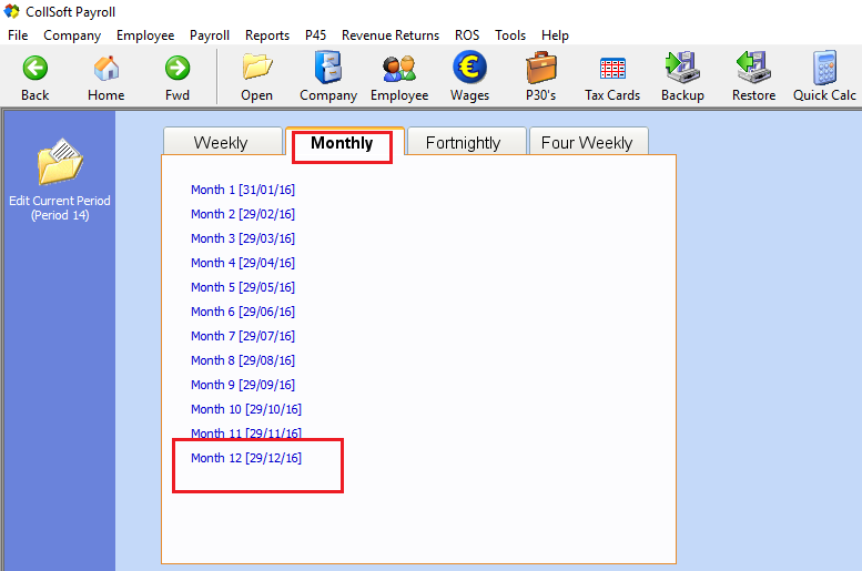 Simply choose each pay frequency, as applies to your payroll, the previous payroll period processed will be displayed by the period number and the payroll date attached to it.