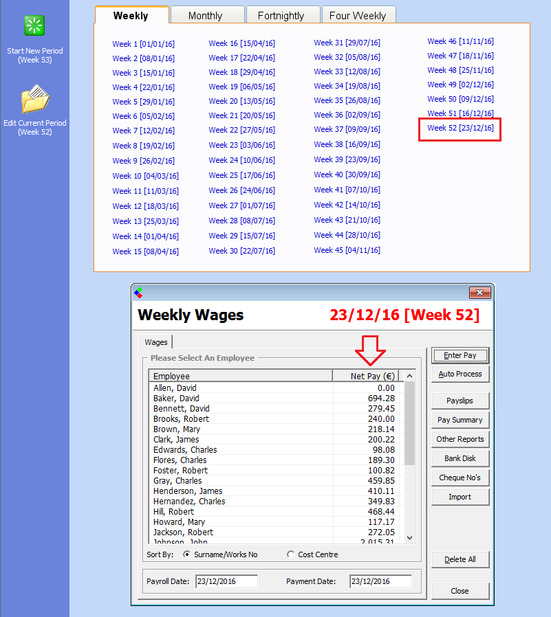 - Check each employee listed is relevant to that period and that the Net Pay is saved against their record. If the Net pay has not been processed for the period the net pay will display as zero.