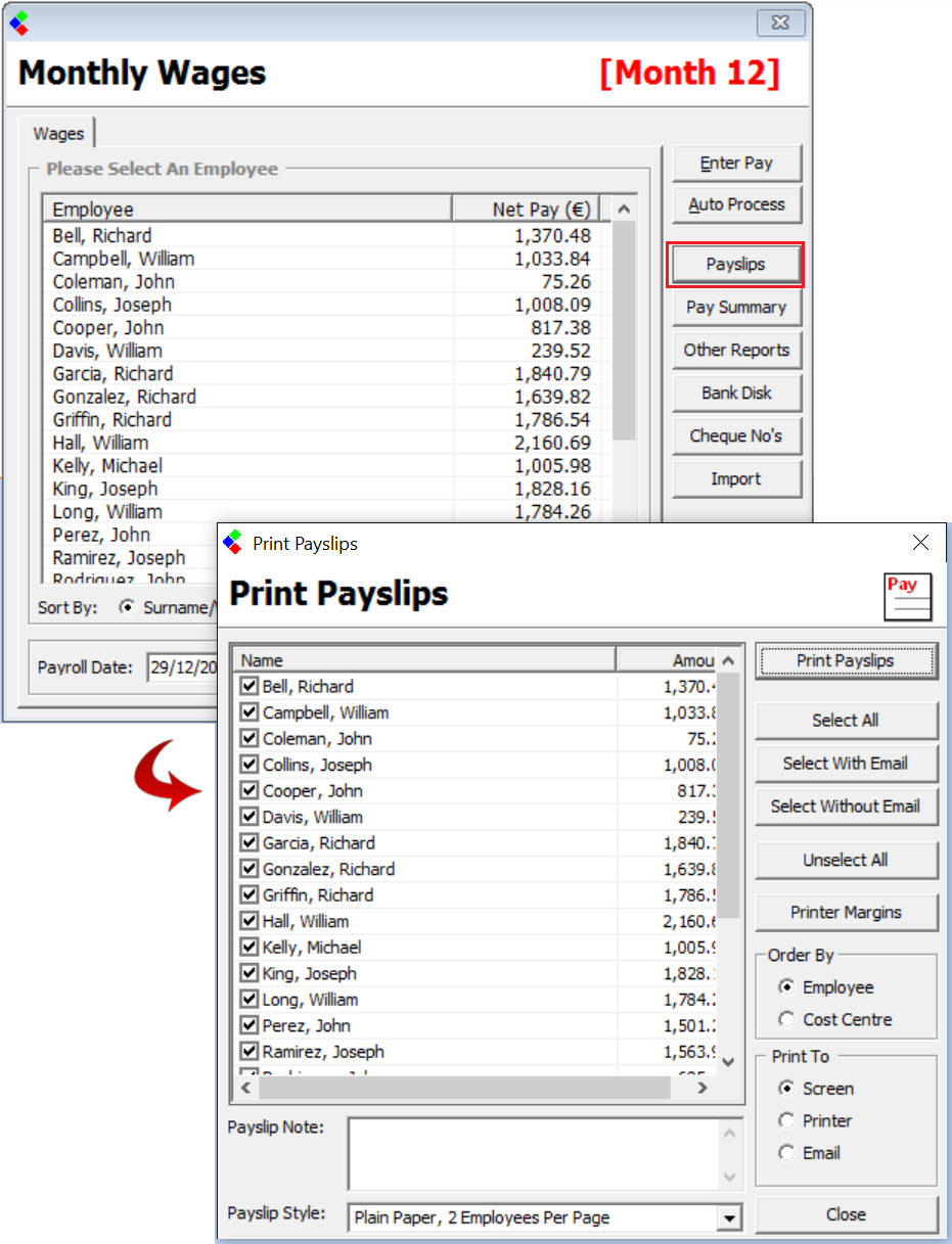 CollSoft Payroll offers an email payslip function which facilitates the confidential issuing of payslips in a quick and efficient manner using a secure CollSoft email server.