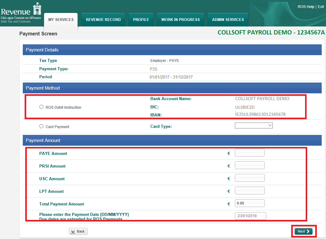 - The date will default to 23/01/2018. It is important that all PAYE/USC/PRSI/LPT payments due to Revenue are settled by this date to avoid incurring interest and penalties.