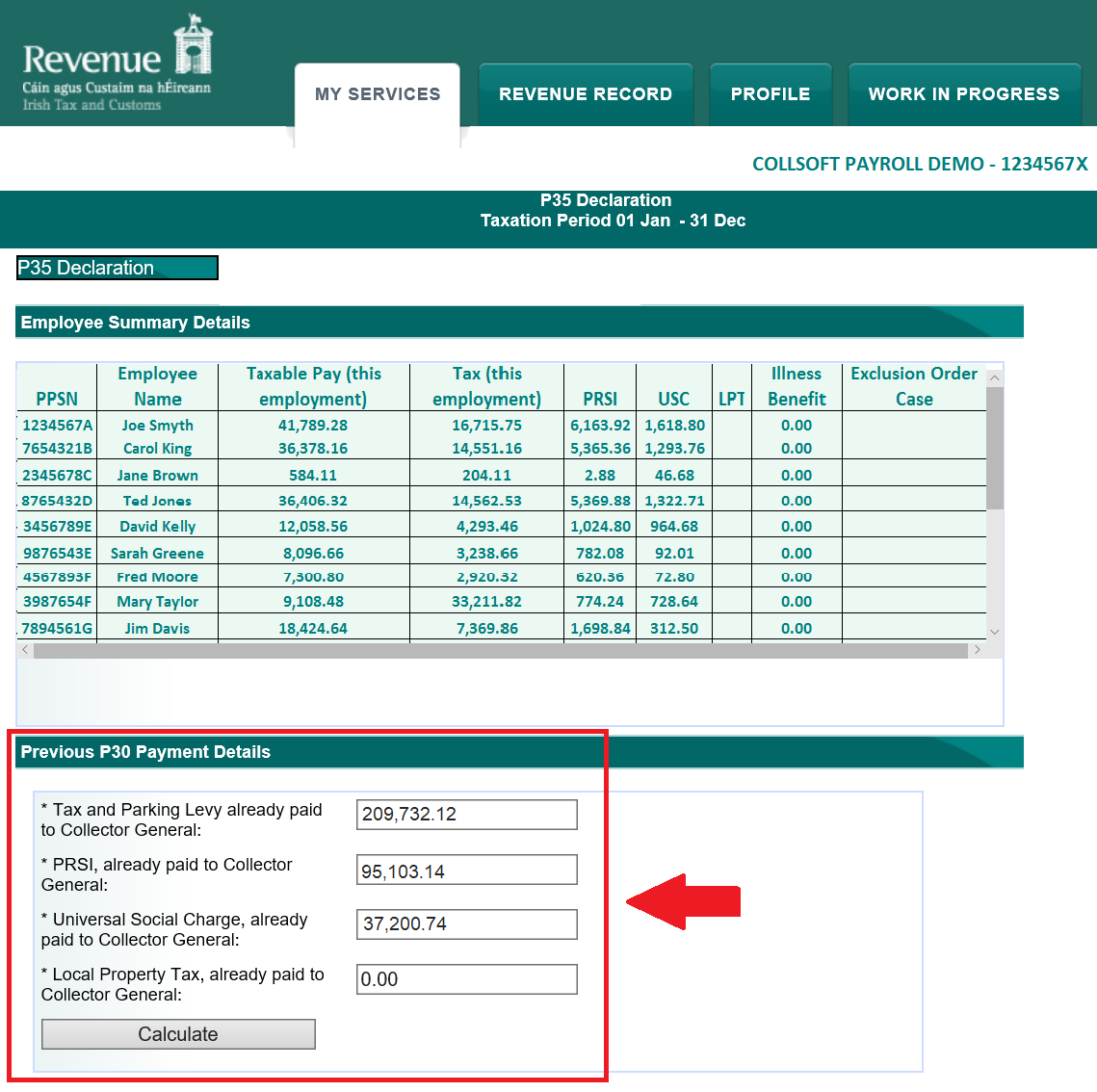 Once the P35 file is added during the P35 submission process, ROS will preview the P35 contents displaying the declaration on screen prior to finally authorising the submission. On this P35 Declaration screen, a summary of P30 payments made will be displayed. This summary of P30 payments is NOT taken from CollSoft it is the Revenue's own account of what has actually been paid and received by them on your account.