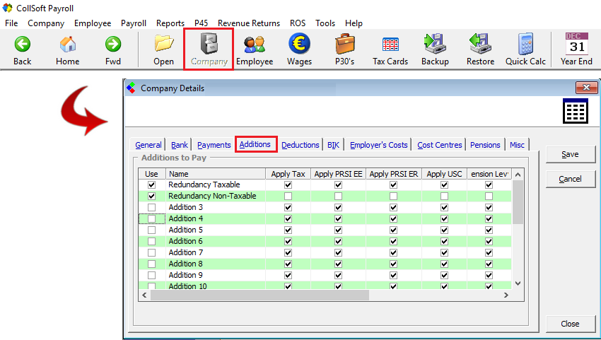 Click on the Additions Tab on the Company Details screen to access the Additions section.