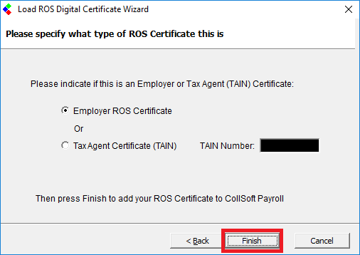 If you are using a Tax Agent Cert (TAIN) select this option and enter your TAIN Number before clicking Finish.