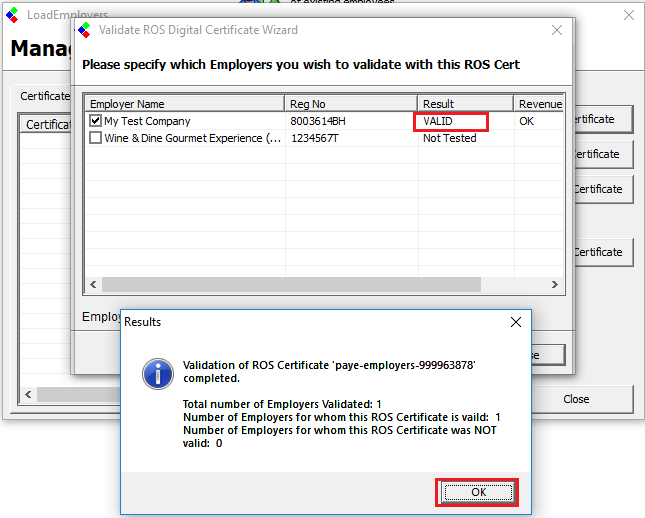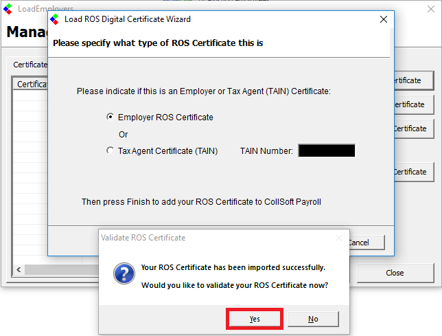 Click Ok, then Click Close and Close again. Your ROS Digital Cert has now been imported into the Collsoft Payroll.