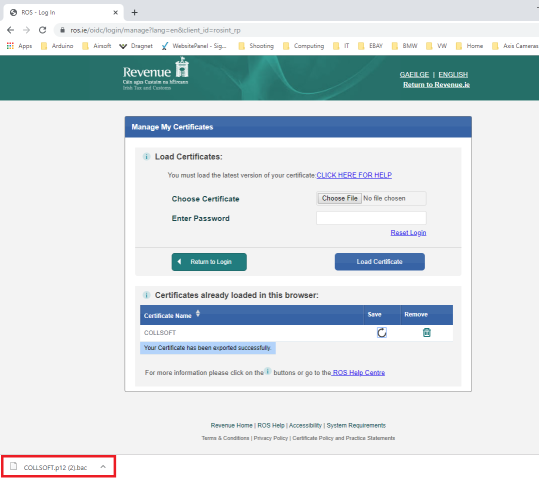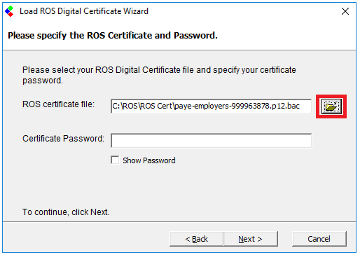 Click on the browse option and locate your ROS Digital Cert on your computer. Your ROS Cert will be a .p12 file and if you have recently downloaded it from the ROS website it may be located in the downloads folder on your computer.