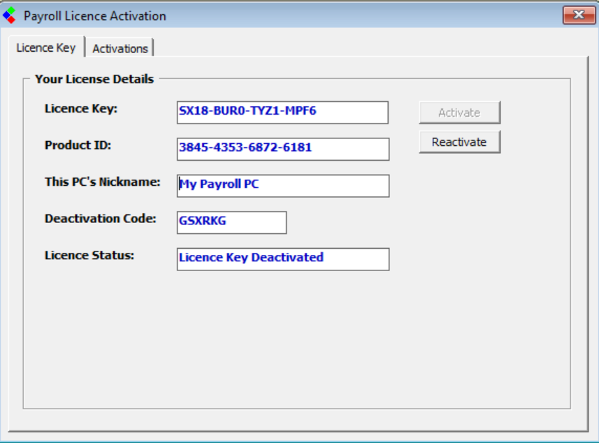 3) On the "Payroll Licence Activation" screen press the "Deactivate" button.