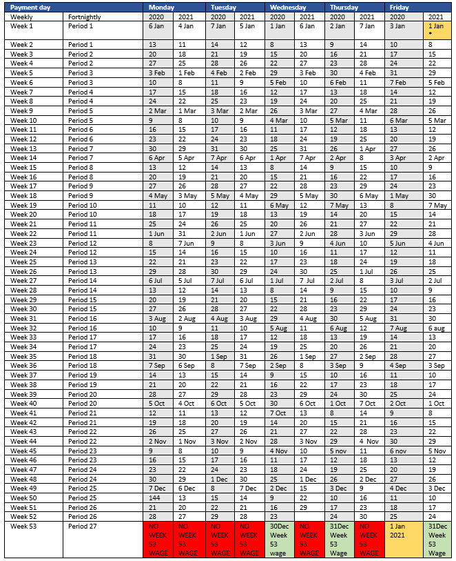 Week 53 occurs where 1 January and 31 December are paydays and a total of 53 pay days arise in the year. Similarly, in a leap year, ‘week 53’ occurs where a pay day falls on 1 or 2 January and 30 or 31 December and there are 53 pay days in the year.