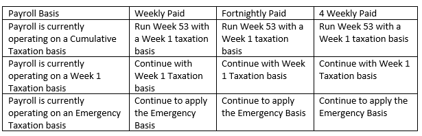 | Payroll is currently operating on a Cumulative Taxation basis | Run Week 53 with a Week 1 taxation basis | Run Week 53 with a Week 1 taxation basis | Run Week 53 with a Week 1 taxation basis |