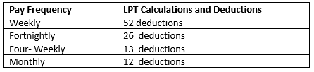 Where an extra pay period occurs in the year, for example, 53 weekly pay periods, Collsoft Payroll will deduct the total amount due over 52 weeks, leaving the 53rd week free of LPT deduction.