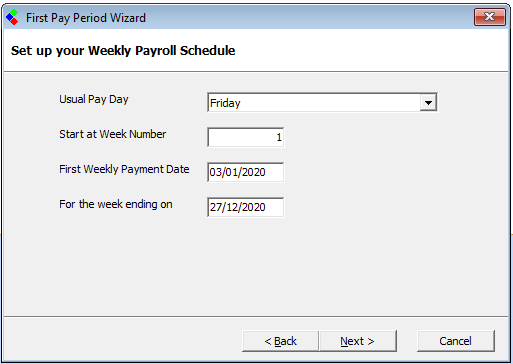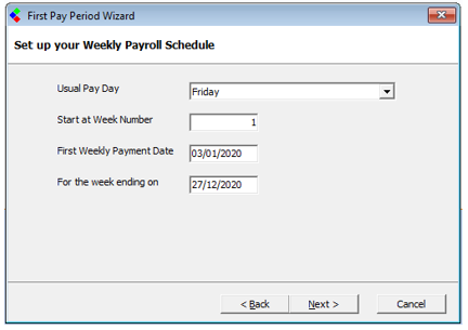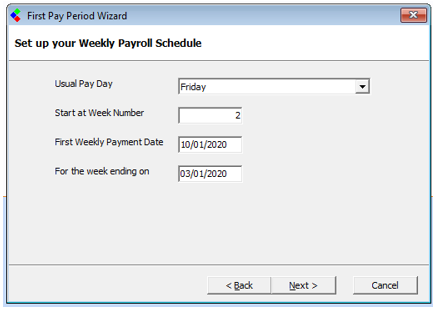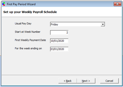 When you run your first Payroll in the Software, you will be shown the “First Pay Period” Wizard where you will be able to specify the starting Week number, the first Payment Date, and the Period Ending Date.