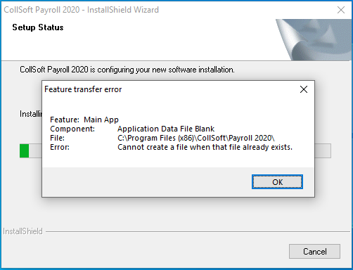 The other variation of this Message is a message saying ACCESS DENIED, which means you don't have permissions to install the payroll in the folder you are trying to install the payroll into.