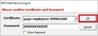 If you are prompted for your Ros Cert and Password. enter them in and click Ok, as shown below.