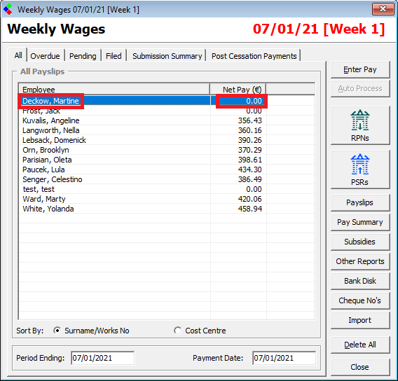Once you click Ok, the payroll will connect with revenue and delete the submission made to revenue for this wage. The Payroll will then delete this wage from the Week 1 also and bring you back to the Weekly Wages screen for Week 1.