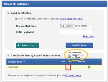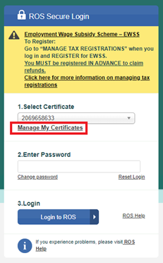 Go to the ROS Login screen and click ‘Manage My Certificates’.