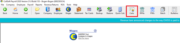 The next step is to import this ROS Digital Certificate into your Payroll software. Open the Payroll Software and log into one of your companies. On the toolbar at the top of your screen press the “Certs” button
