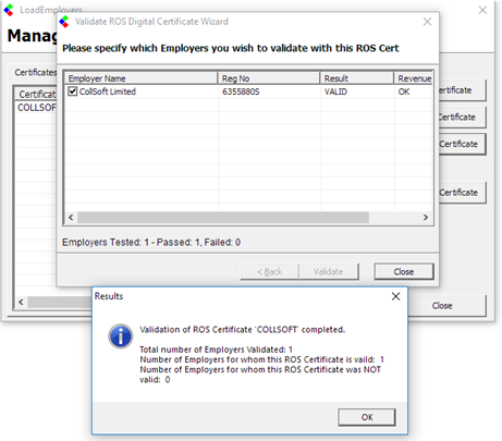 This process will check that your ROS digital certificate is valid for use with the Employer by calling the ROS web services to validate the certificate, against all of the employers set up in your Payroll Software.