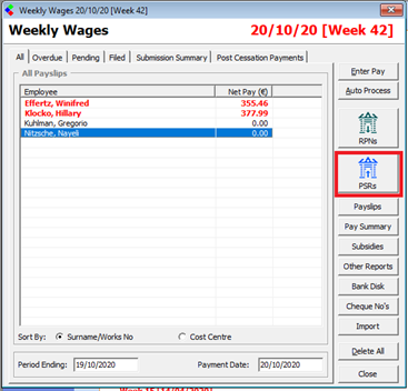 So the first two wages have been processed as normal and are ready to be filed. You will notice, that the employees are highlighted in red. To begin filing press the “PSRs” button on the wages listing screen:
